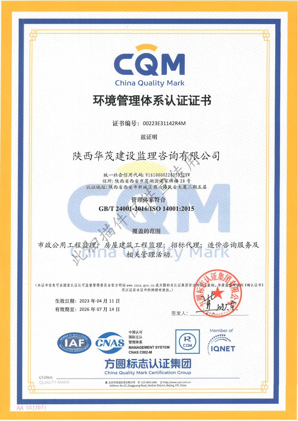 环境管理体系认证证...